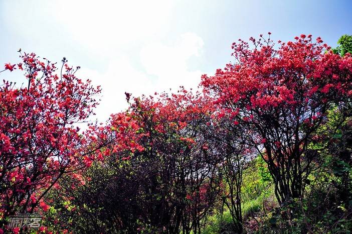 这里虽然不是自然保护区,但仍然保留着原始的气息。时值初春,山里许多植物都亮出了新装,在这深深的山野中,最令人心动的是那逢春盛放的漫山遍野的野杜鹃,一朵一朵的密密麻麻地开满了枝头,、鲜红的,一蔟簇、一丛丛地镶嵌在山坡上、古树旁、小溪边。这满山的花草树木虽不艳丽,但却很养眼,很和谐,雾里看花,能让你久久地观赏,慢慢地陶醉,深深地着迷.。