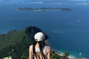 山顶两侧是大海、远处飘浮的小岛、天空的白云,景色美极了