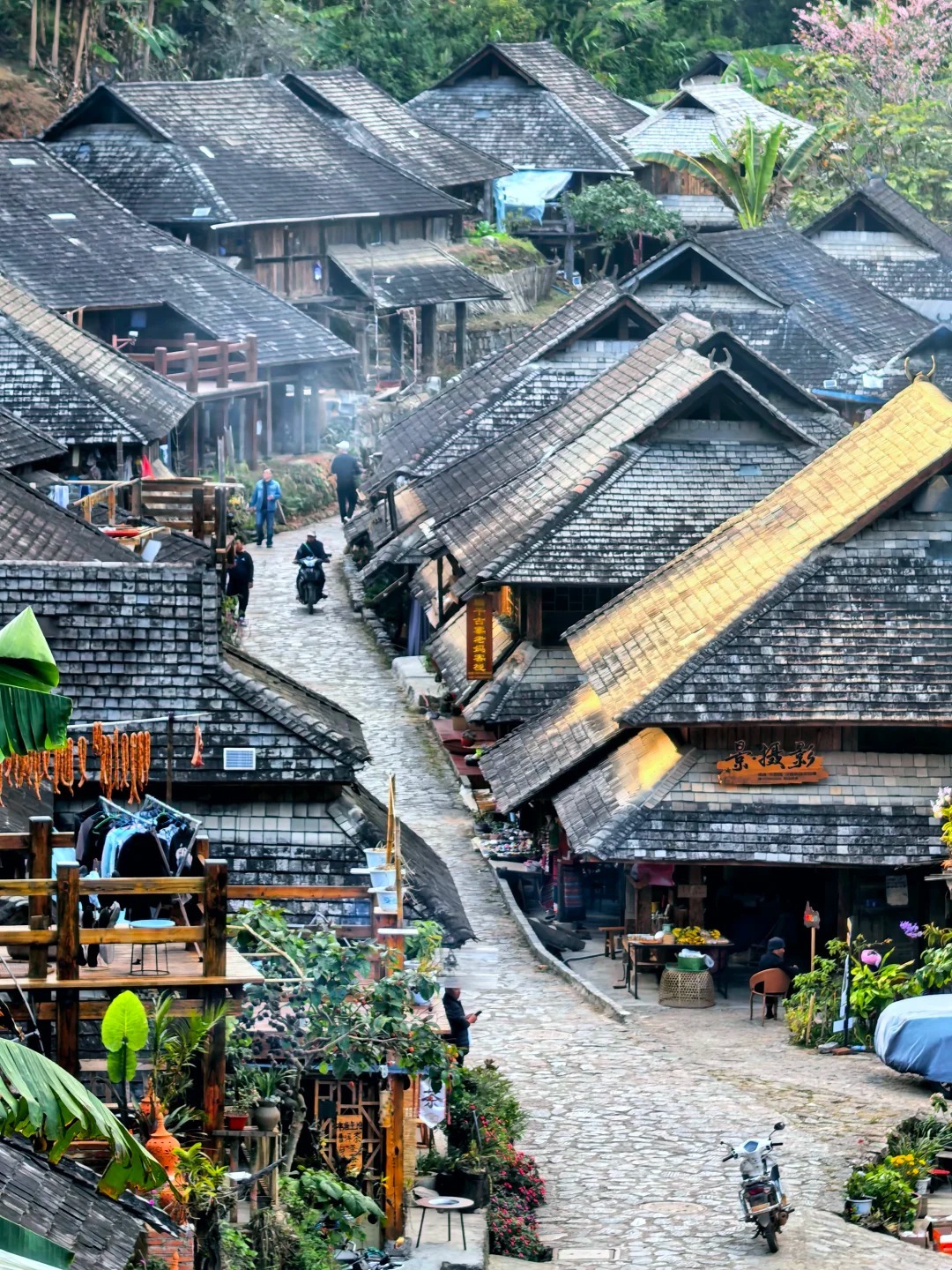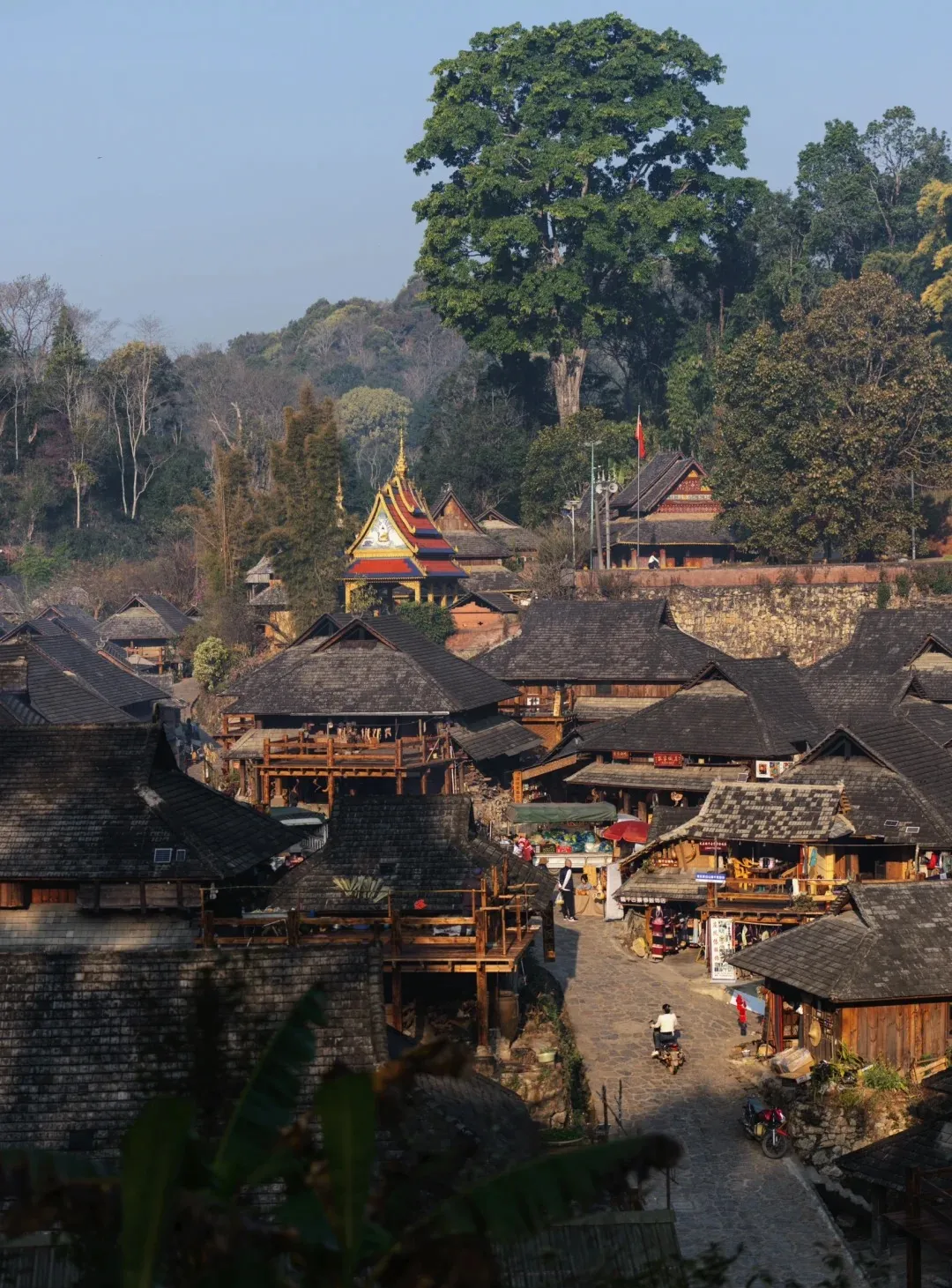 游玩结束后,乘车前往【景迈山】,先到达的是《一点就到家》拍摄地【糯干古寨】,这里的傣族与大家印象中的傣族或有出入,旧居景迈山的傣族人有传统傣族的温柔也有大山的豪放,真正让人惊艳的时糯干古寨的古朴和祥和,原始的干栏式建筑保存完整,百姓自如地生活在村中,祥和的氛围被许多人誉为“真正的世外桃源”。