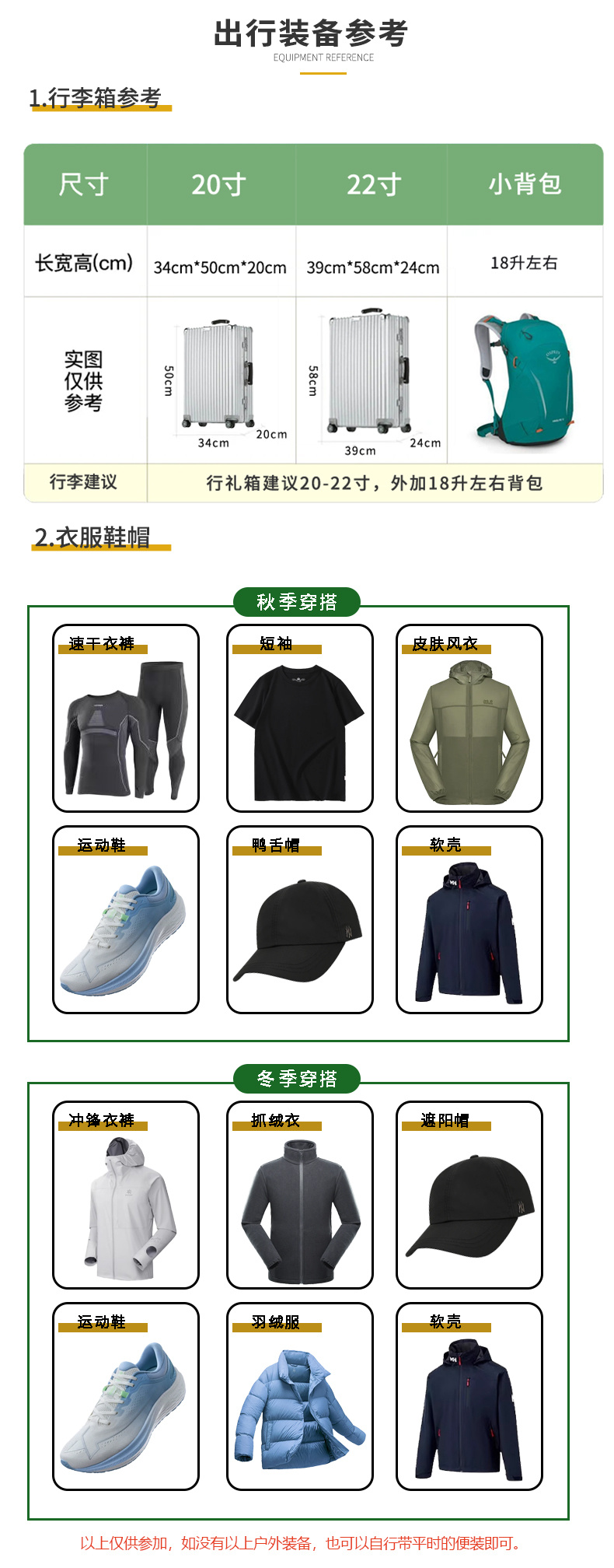 身份证原件、换洗衣服和其他,徒步鞋运动鞋,或其他平底鞋、长袖衣裤、背包,雨伞(有备无患)。