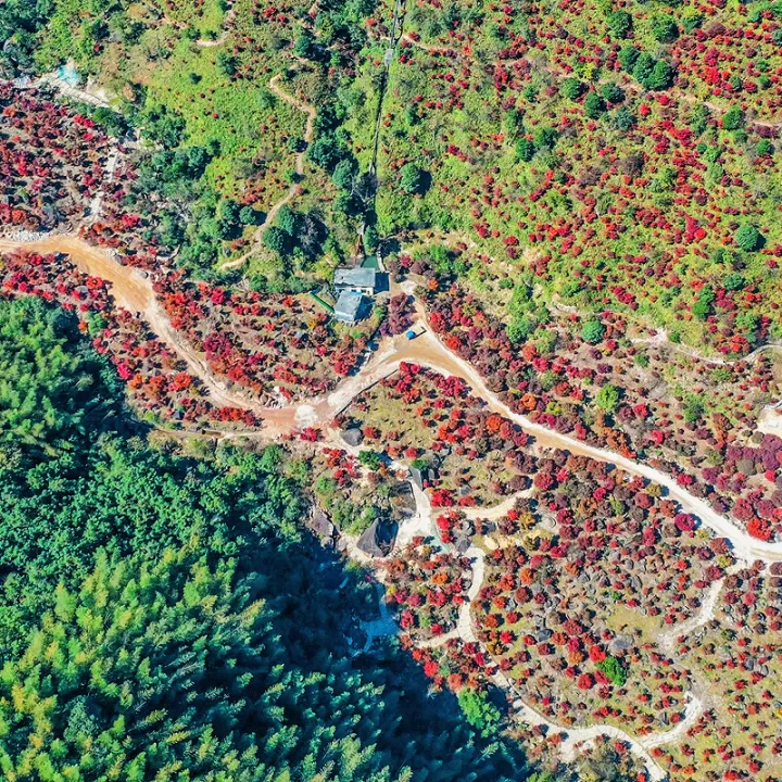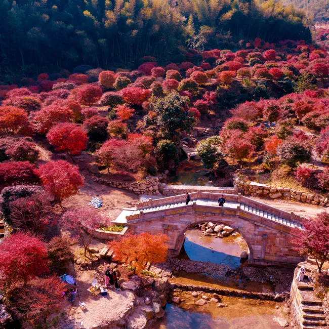 12:30 左右开始闲逛枫叶林,【十里枫叶林】,抬眼望去,层层叠叠的枫叶红得浓烈,红得似火,染红了山谷,染红了山涧,就像一条鲜红的地毯铺在蜿蜒曲折的山谷中,美轮美奂,美不胜收。有小桥,有竹林,有牌坊,有泥房,在枫叶的衬托下格外出片,从高空俯瞰,火红的枫叶与竹林山色构成了一幅秋日“枫”景画卷。