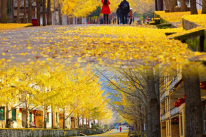 黄金大道,街道边种了两排银杏树,和白色的路灯相配,宛若欧洲小镇,风情万种,金秋的帽子峰,呈现给游客一个五彩斑斓的世界。