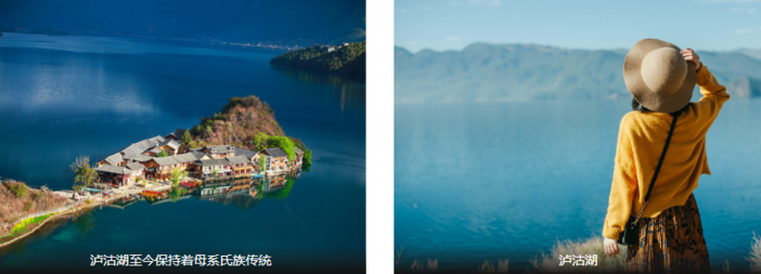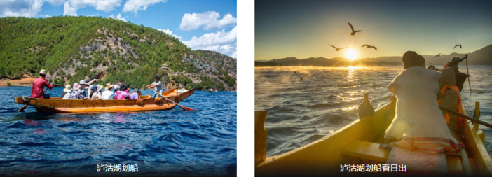 【乘坐摩梭猪槽船游湖,登里务比岛】(游玩约1个小时)清澈透眼的湖水,四周风景如诗如画,神奇的湖水随天空色彩变化,神秘莫测,闭目聆听摩梭船夫吟唱摩梭歌谣,感悟“摩梭三绝”:湖上之舟、舟上之人、人之歌声。
