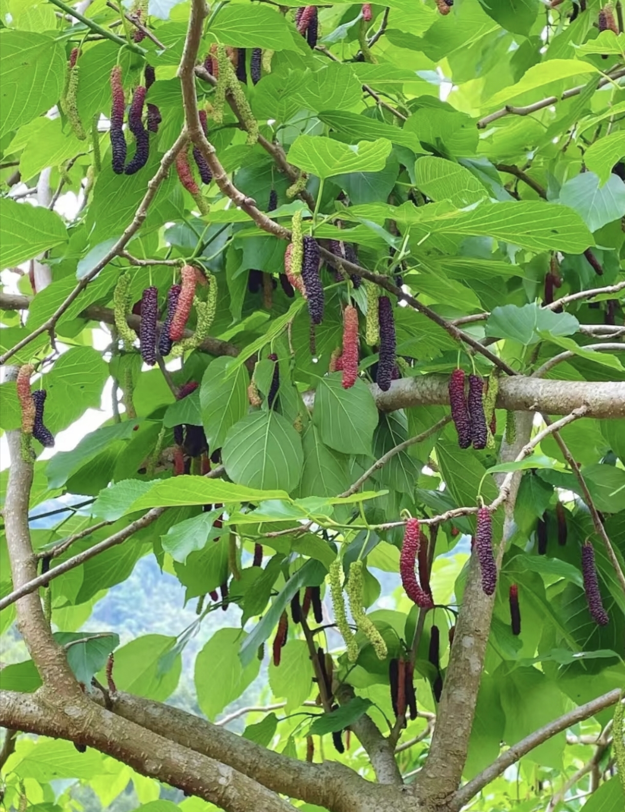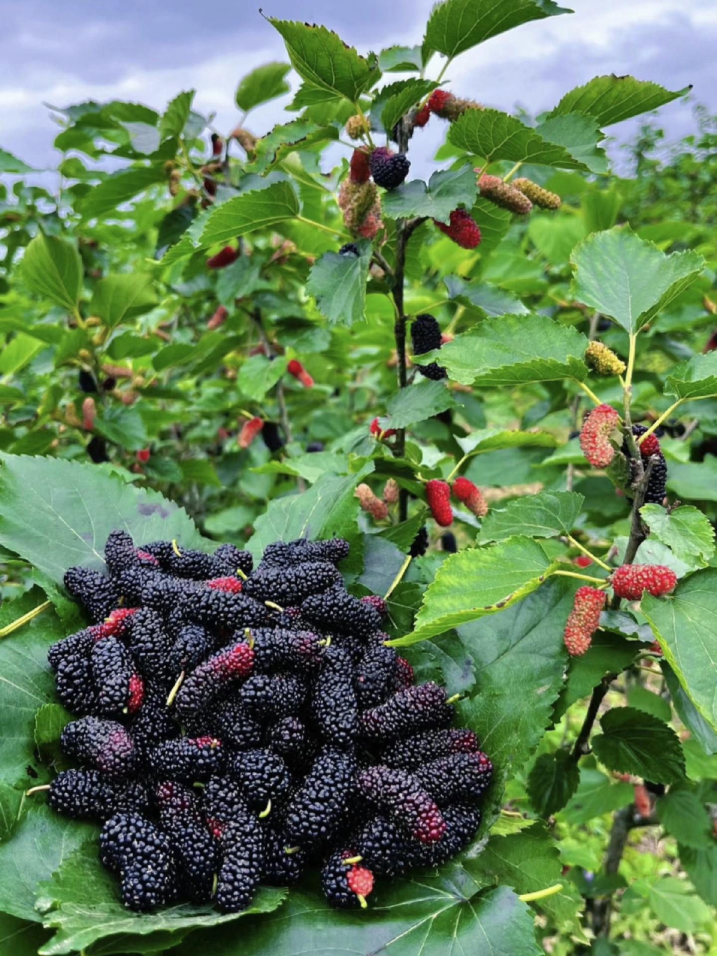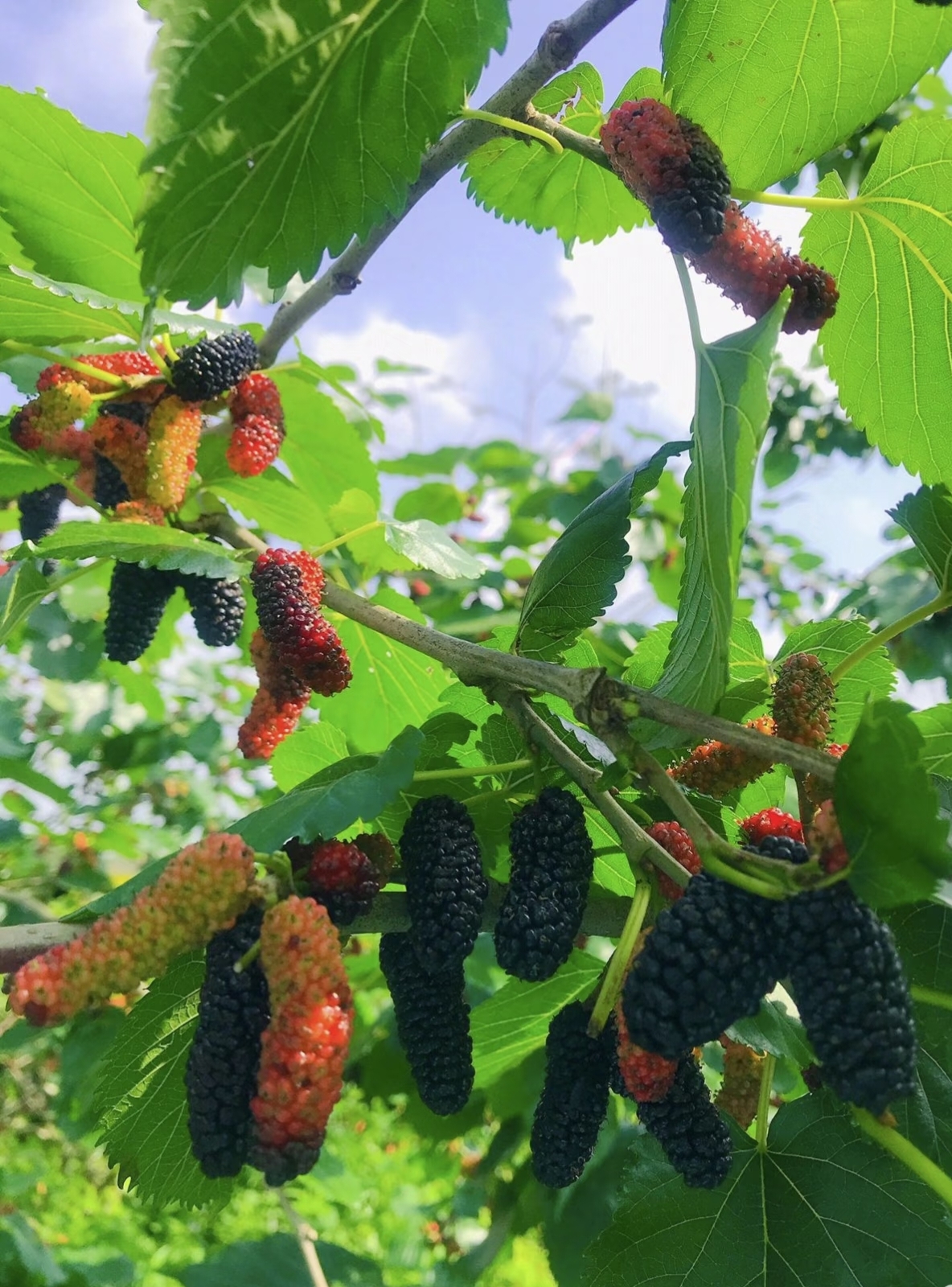 摘桑葚,10元入园可试吃,带走15元/20元一斤,有本土桑葚,也有台湾长条毛毛虫桑葚。