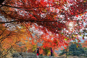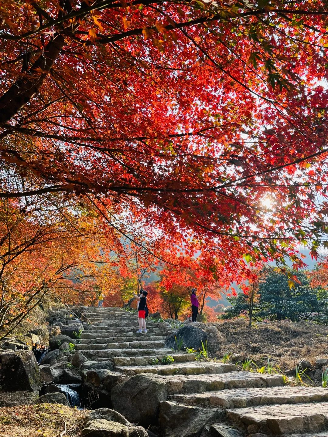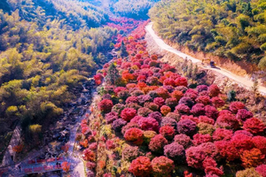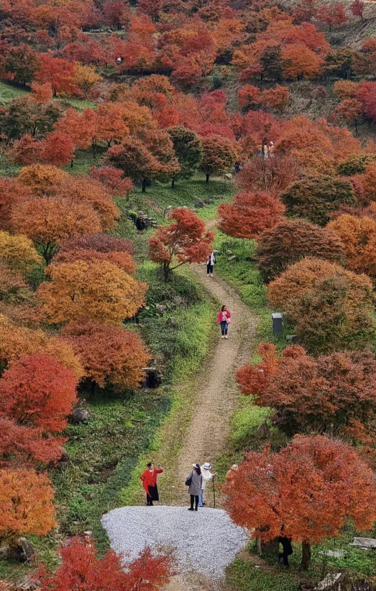 大约下午2点左右到达【十万株枫叶林】,跟随领队一起去赏枫,抬眼望去,层层叠叠的枫叶红得浓烈,红得似火,染红了山谷,染红了山涧,就像一条鲜红的地毯铺在蜿蜒曲折的山谷中,美轮美奂,美不胜收(当地有少量农庄,最好带上干粮)。