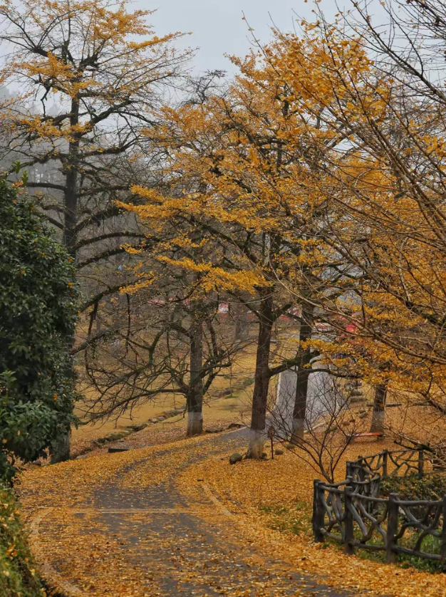 或挂在枝头或飘落地面,漫山遍野尽披“黄金甲”。