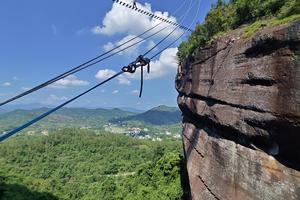 越王山天空栈道飞拉达:采用国际上最新的不间断保护方式,体验者将在穿着专业的安全带及保护挽索后,通过一把不间断保护锁进入线路中的生命线保护钢缆。该钢缆从起点到终点全程贯通,而不间断锁在能轻松通过中间节点前题下,如果没有专业钥匙,就不会从生命线脱落出来,从而让即使从未有过攀岩经验的体验者也能在全程受保护的状态下完成越王山悬崖上的探险之旅。