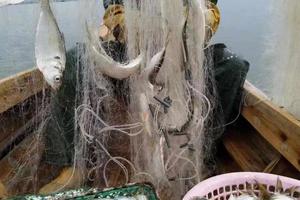 出海捕鱼是渔民撒网,我们坐船出去都不用动手,鱼获我们免费带走。