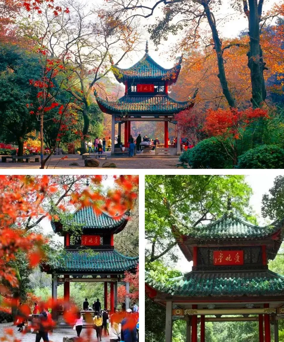10:30游览衡山七十二峰之尾峰【岳麓山】(门票免费,游览约 1.5小时,景区内环保车往返30元/人自理,也可步行往返)。有着江南四大名亭之称的【爱晚亭】,这里得名于杜牧的诗句“停车坐爱枫林晚,霜叶红于二月花”。