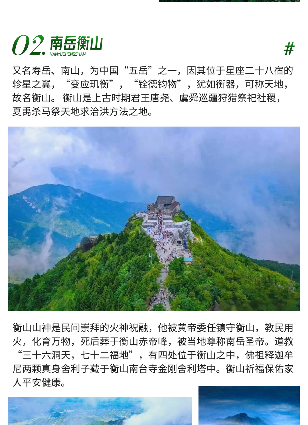 抵达最高峰——祝融峰海拔高度1290米,那有祝融殿、望月坛、南天门牌坊、“钢丝王子”阿迪力世界纪录创造地,会仙桥观音岩,看云海翻腾,日出胜景,南岳衡山风光美不胜收。