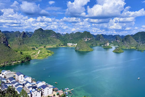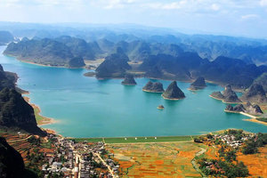 它被誉为"水上桂林"、"大里的海洋”。湖中有十多个大小岛屿,四周环绕着喀斯特峰林,沿岸点缀着几百个壮族干栏式村寨,湖面平静如镜,景色如画。
