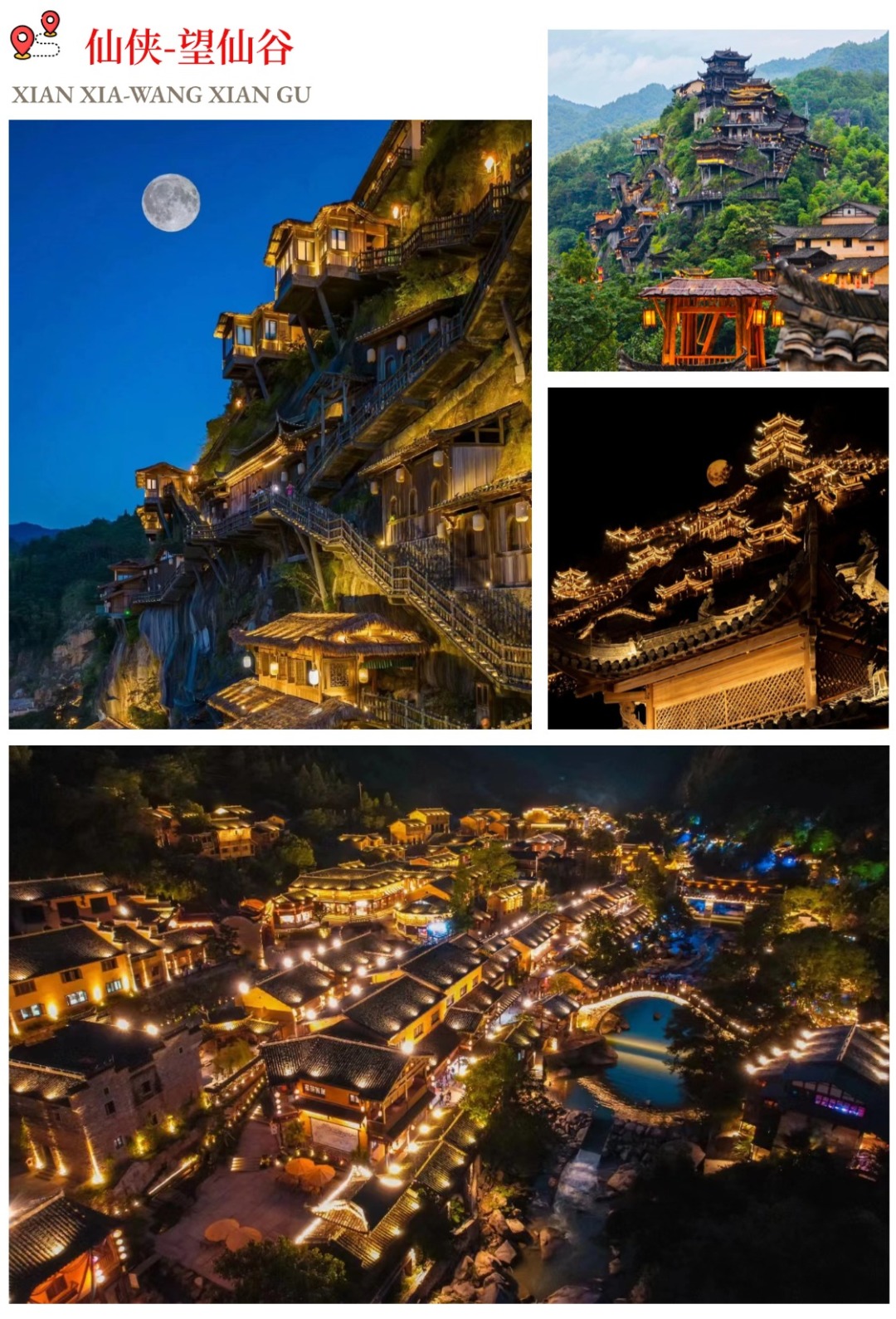 后乘车前往上饶热门景区-【望仙谷*白+黑深度畅游】景区内游览【青云桥】、【寻仙路】、【廊桥】、【白鹤崖】望仙谷的夜晚就是幻景。从悬崖建筑方向看村庄,万家灯火、繁华落尽。从村庄方向看悬崖建筑,如天上人间、神秘莫测。夜景如一首华章,有平铺直叙、有峰回路转、有高潮迭起,打造了一个灯光的视觉盛宴。观赏完夜景后入住望仙谷外民宿酒店。