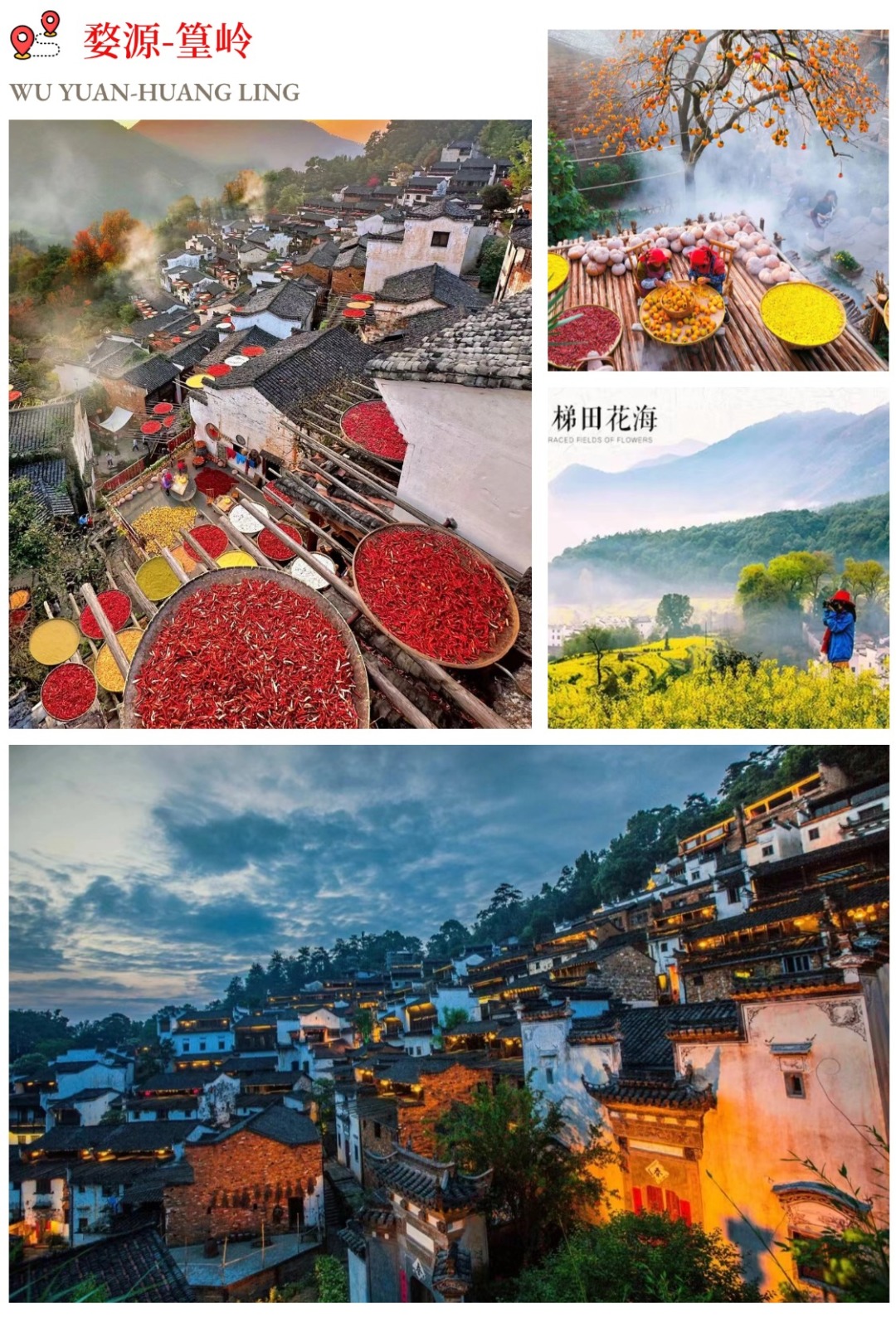 酒店用早后,于酒店大堂集合乘车赴山崖上的古民居村【篁岭·梯田花海】(往返缆车135元/人必自理,3-4月165元/人,购往返缆车赠送篁岭门票)(游览时间约3小时)乘观光索道上山盘山而入,豁然开朗,一条天街贯穿东西,两旁白墙黑瓦,古建魏然。这座挂在山崖上600多年的古村落,因大清朝曾出过父子相国而文风斐然。阳春三月,篁岭梯田花海不同于平原花海,这里的油菜花随山就势,重叠有序,金黄色的花带与白墙黛瓦的徽派建筑相映成趣,被誉为"上帝的指纹"和"全球十大最美梯田"之一。除了油菜花,篁岭的古村风貌和春季活动也同样精彩。徽派古村贯穿整个村落的天街,两旁徽式商铺林立,官邸民居相邻,仿佛一幅流动的"清明上河图"。花朝节,每年春季(通常从3月开始),篁岭会举办花朝节,有十二花神巡游、花海民谣音乐会等丰富的活动。春日晒秋,春天的"晒秋"也别有风味,可以看到晒匾里晾晒的鲜笋、蕨菜等当季农作物。 四季鲜花,篁岭被誉为"鲜花小镇",春季除了油菜花,桃花、梨花、玉兰、樱花等也会相继绽放。