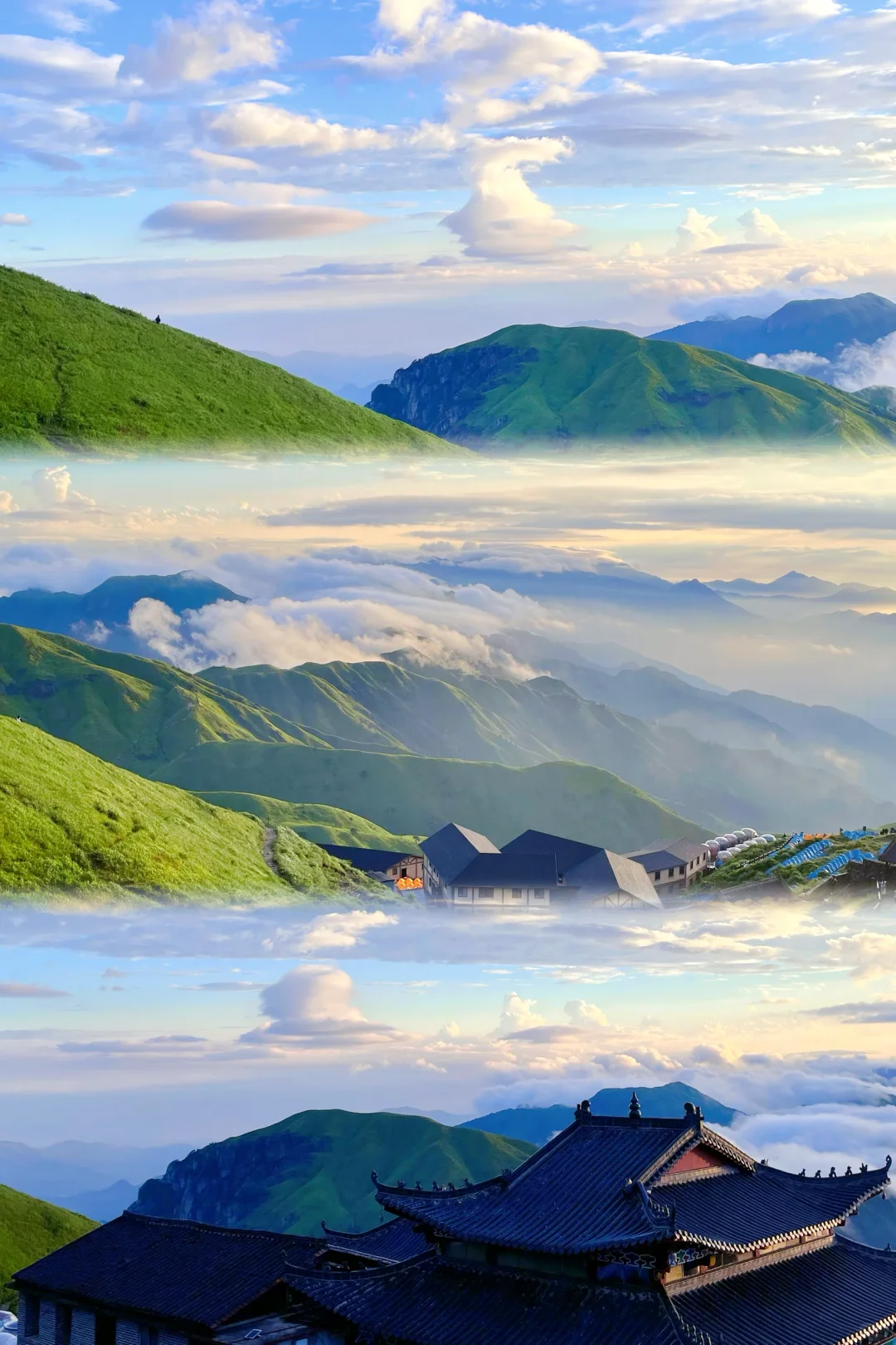 十万亩草甸核心带:从金顶至发云界,连绵不绝的草坡海拔均在1600米以上,春夏绿意汹涌,秋季灿如金原,被誉为“江南生命高原”。