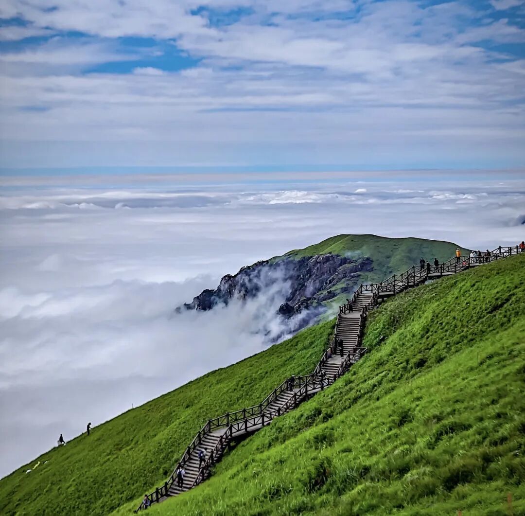 白鹤峰金顶:武功山最高点,立有碑刻,是观日出、云海、星空的最佳位置。立于此处可俯瞰十万亩草甸起伏如浪。