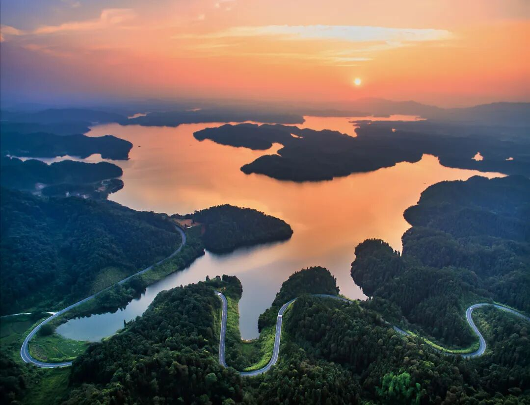 晨雾如乳,群岛浮游。乘早船入湖,登爱情岛触同心锁痕,至龙王阁迎破晓之光——传说在此凝为白鹭的翅影。198平方公里画卷中,50平方公里碧水串联舞龙湖、钟山峡、钤阳湖三部曲,99座岛屿