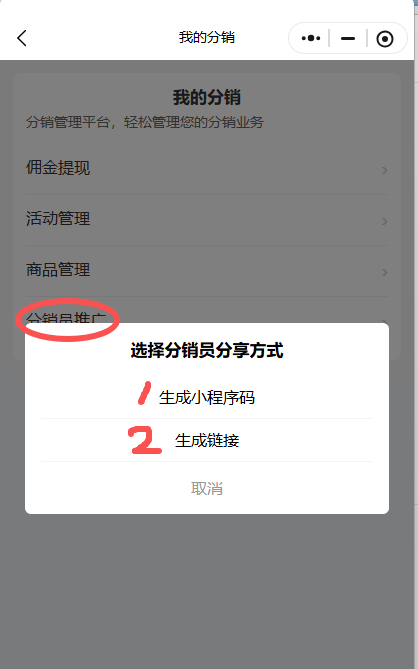 ② 通过“我的分销”——分销员推广——生成小程序码 / 生成链接转发。